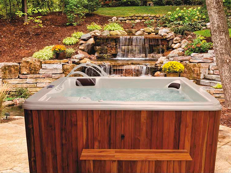 Tina de jardín de amplias dimensiones, para disfrutar con la familia y olvidarse del estrés. Su equipo de última generación mantiene el agua limpia y con la temperatura adecuada.