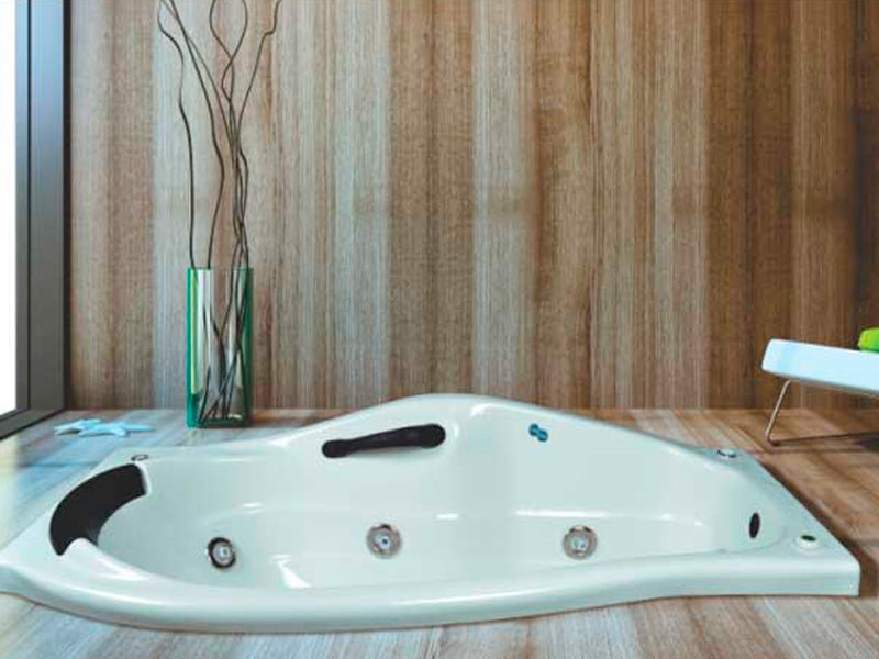 Amplia y cómoda bañera de formas suaves y amplias, con hidromasaje abdominal, con cabecera imitación piel y agarradera para un fácil y seguro acceso a ella.
